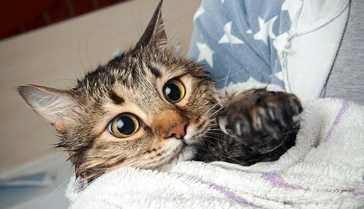 However, wet fur is extremely uncomfortable and, due to the nature of your cat’s fur, takes a long time to dry. Furthermore, wet fur is heavier than dry fur and your cat becomes less agile, slower in movement, and this affects its natural instinct to run when it feels threatened.